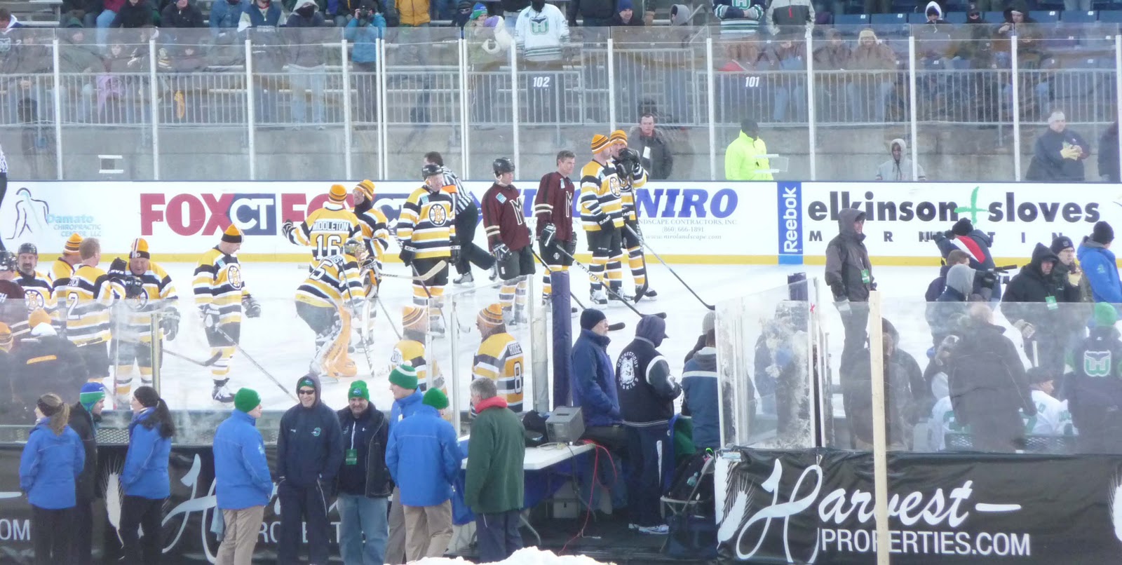 After the celebrity/alumni game, there was a CT Whale vs Providence Bruins game. However, once the sun went down the temperature dropped dramatically and we knew we would be frozen solid if we sat out there for another couple of hours. So we left.