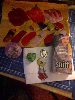 Everything was in a nice bag with sushi on it. The bag will definitely come in handy for storing some of my loose scrapbook embellishments! It is made out of a nice, strong material too. We don’t have cool stuff like that around here! Also in the package was a silver heart with “Love” written on the other side of it. A nice little tin with fairies on it (I already have some scrapbooking brads being stored in it! It is the perfect size and so pretty!) Inside the tin was a green heart shaped stone that is very smooth and great colors. And there were some decorative tissues. Which will definitely come in handy in my purse this winter! My secret santa, Tracy, also sent me a letter telling me a little bit about herself and her family.